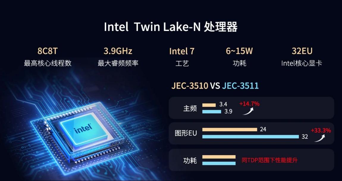 JEC-3511通用型工業BOX整機搭載全新一代英特爾®新一代 Twin Lake-N 處理器,相較Alder Lake-N平臺,AI推理性能提升40%。采用先進Intel 7制程工藝,在主頻提升至3.9GHz的同時,整體功耗降低約15%,實現性能與能效的雙重優化。