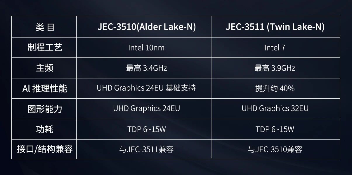 相較前代主力機型JEC-3510,JEC-3511支持PIN對PIN兼容,實現零成本替換升級,助力用戶在工業自動化、邊緣AI、工業網關等應用場景中輕松完成性能躍遷。