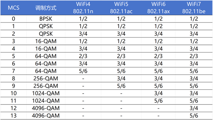 指調(diào)制子載波的方式。由于一個子載波承載一個Symbol,編碼方式代表著一個Symbol能承載的bit數(shù)量,常見編碼方式有BPSK、QPSK、QAM。根據(jù)以下數(shù)據(jù)得到WiFi7編碼方式目前最大12bit/Symbol。