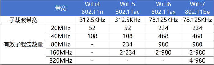 子載波是用于數(shù)據(jù)傳輸?shù)念l域信號,是頻域資源的一部分,不同調(diào)制方式及不同頻寬下的子載波數(shù)量不一樣,和帶寬以及每個子載波的帶寬相關。根據(jù)以下數(shù)據(jù)得到WiFi7有效子載波數(shù)量最大3920(4*980)。