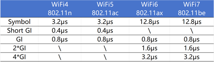 符號時間是Symbol時間與GI時間相加的和。Symbol表示一次傳輸?shù)臄?shù)據(jù),是時域上的傳輸信號;GI是相鄰的兩個Symbol之間的時間空隙,以避免 Symbol 之間相互干擾。根據(jù)以下數(shù)據(jù)得到WiFi7最小符號時間是13.6us(12.8us+0.8us),也即0.0000136s。