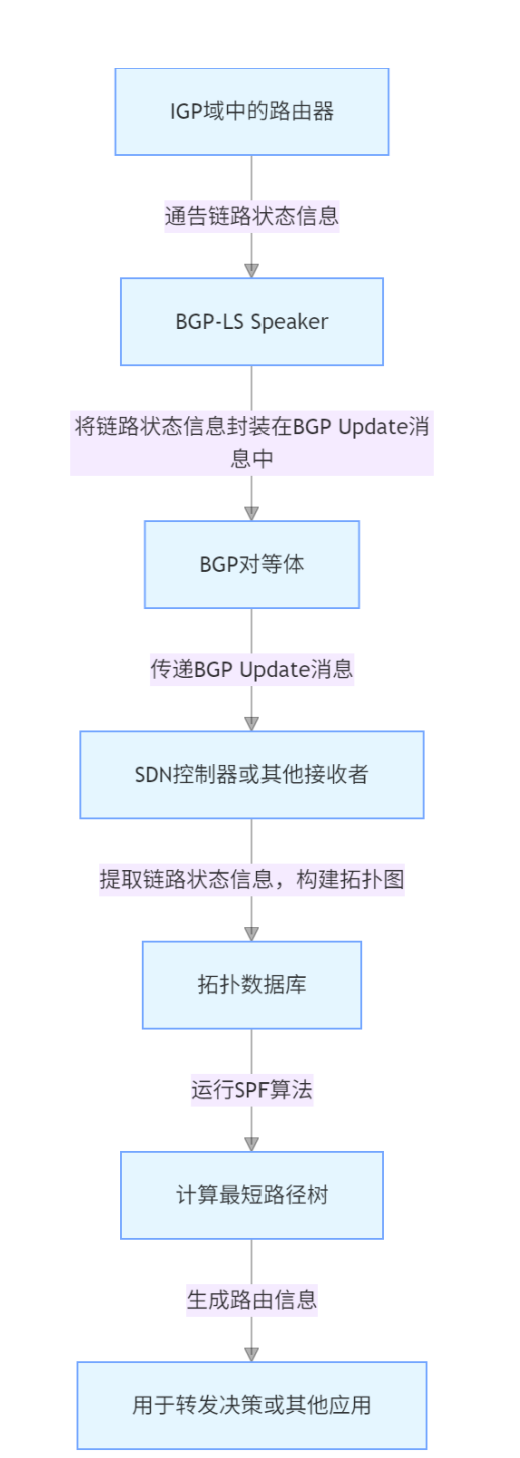 BGP-LS-SPF 功能涉及 BGP-LS(Border Gateway Protocol - Link State)收集網(wǎng)絡(luò)拓?fù)湫畔ⅲ倮?SPF(Shortest Path First)算法計算最短路徑。其功能原理如下圖: