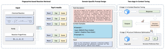 為此,TeleAI聯合華東師范大學等單位提出了一項“ReactGPT”框架,集成了基于化學反應的指紋檢索模塊、特定領域提示設計模塊、兩階段上下文調優模塊。
