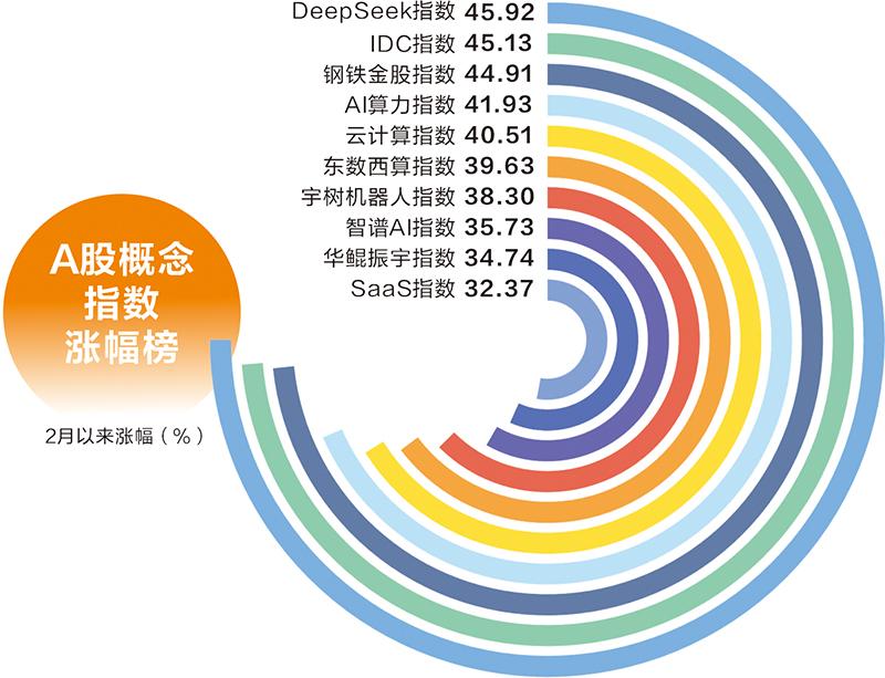 今年以來,深度求索(DeepSeek)概念指數大幅飆升,算力產業鏈方向漲勢尤為迅猛,包括算力租賃(IDC)、云計算、AI算力等指數春節后均飆漲逾40%。