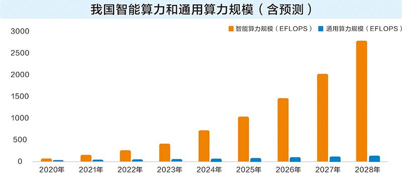 相比通用算力,智能算力的增幅已達到同期通用算力增幅的3倍以上。2024年我國通用算力規模達71.5EFLOPS,同比增長20.6%。據IDC預測,2025年,中國通用算力規模預計達85.8EFLOPS,同比增長20%;智能算力規模將達1037.3EFLOPS,同比增長43%,遠高于通用算力增幅。總體來看,2025—2028年中國智能算力規模和通用算力規模年復合增長率預計分別達39.94%和18.31%。
