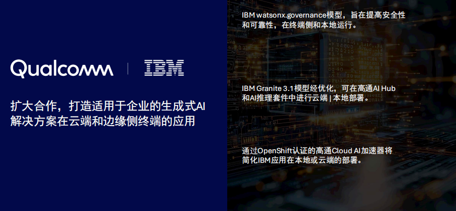 2 月 27 日消息,高通公司今天宣布,將在生成式 AI 在企業(yè)級場景落地方面與 IBM 進(jìn)行合作,高通表示,雙方將共同打造適用于企業(yè)的生成式 AI 解決方案在云端和邊緣側(cè)終端的應(yīng)用。
