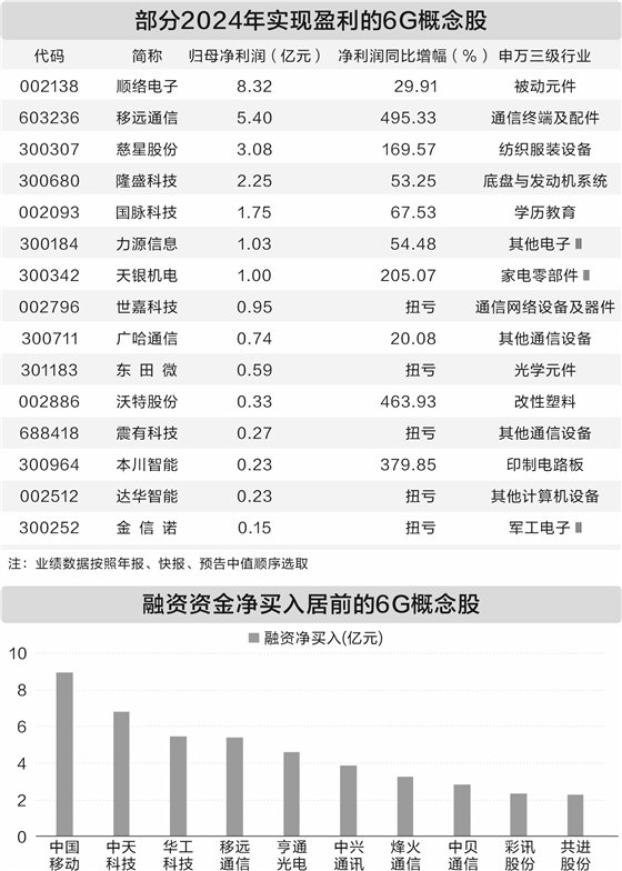 據證券時報·數據寶統計,6G概念股中,2024年實現盈利且經營同比向好的有15只。其中,移遠通信(83.450, 0.87, 1.05%)、沃特股份(20.640, -1.10, -5.06%)、本川智能(48.680, 1.69, 3.60%)、天銀機電(18.510, -0.41, -2.17%)、慈星股份(9.410, -0.37, -3.78%)(維權)實現凈利潤同比翻倍。