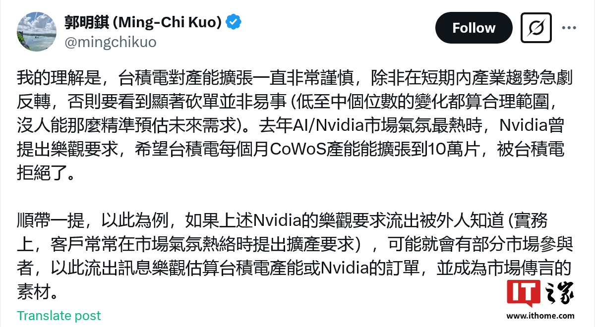 IT之家另悉,郭明錤認為臺積電在產能擴張一事上一直“非常謹慎”,一般不會出現顯著砍單的情況。