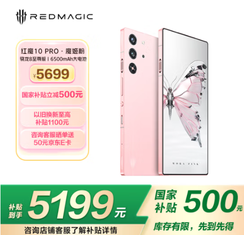 紅魔10 Pro搭載驍龍8至尊版移動平臺、紅芯R3自研電競芯片,采用ICE X魔冷散熱系統,采用支持AI屏下攝像技術的1.5K悟空屏,配置CUBE能量魔方,游戲體驗更進一步。紅魔10 Pro Mora Pink 16GB+512GB京東原價5699元,享受國家補貼500元,到手價5199元。