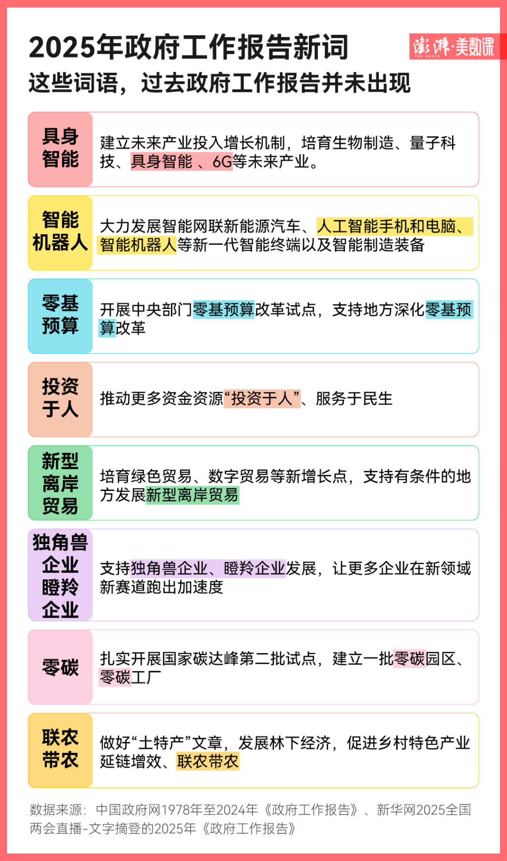 另外,在2025年《政府工作報告》中,還出現了過去47年未曾提及的詞語,例如“具身智能”“智能機器人”“投資于人”等。