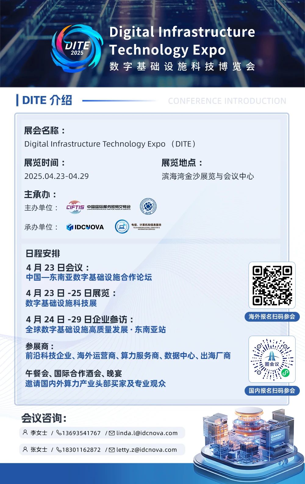 2025年4月23日至29日,由中國國際服務(wù)貿(mào)易交易會與數(shù)字基礎(chǔ)設(shè)施技術(shù)委員會(DITC)聯(lián)合主辦,中國國際服務(wù)貿(mào)易交易會計(jì)算機(jī)電信專題與中國IDC圈承辦的“數(shù)字基礎(chǔ)設(shè)施科技展(Digital Infrastructure Technology Expo,DITE 2025)”系列活動將正式啟動。