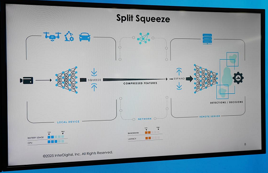 除此之外,InterDigital現場還展現了拆分壓縮計算的創新技術,著重于解決AI所帶來數據、延遲、帶寬、功耗等沖突問題,該項技術通過將AI/ML模型拆分為兩個獨立的組件,分別在本地設備與遠程服務器上運行,從而達到平衡AI需求的目的。