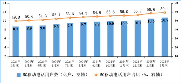 飛象網(wǎng)訊(致新/文)4月24日消息,工信部近日公布2025年一季度通信業(yè)經(jīng)濟運行情況。截至2025年3月末,三家基礎(chǔ)電信企業(yè)及中國廣電的移動電話用戶總數(shù)達18億戶,比上年末凈增994.5萬戶。其中,5G移動電話用戶達10.68億戶,比上年末凈增5445萬戶,占移動電話用戶的59.4%。