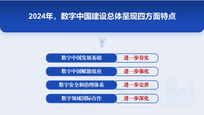 為貫徹落實黨中央、國務院關于數字中國建設的重要部署,國家數據局會同有關單位系統總結2024年數字中國建設重要進展和工作成效,編制形成《數字中國發展報告(2024年)》(以下簡稱《報告》)。《報告》提出,2024年數字中國建設總體呈現發展基礎進一步夯實、賦能效應進一步強化、數字安全和治理體系進一步完善、數字領域國際合作進一步深化等四方面特點。