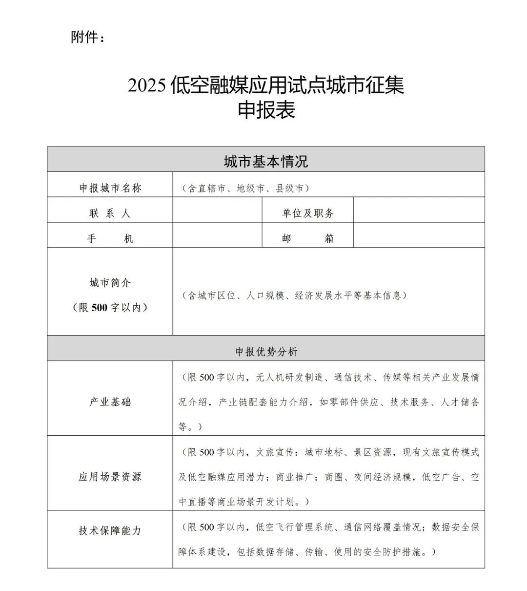 材料提交:申報城市請于2025年8月31日前,將申報材料(紙質版一式三份,加蓋公章;電子版發送至指定郵箱)報送至低空融媒辦公室。