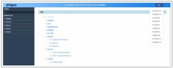 報告輸出:自動輸出PDF/Excel/CSV報告,包含吞吐量-時延曲線、攻擊詳細統計信息、端口統計、協議統計等。