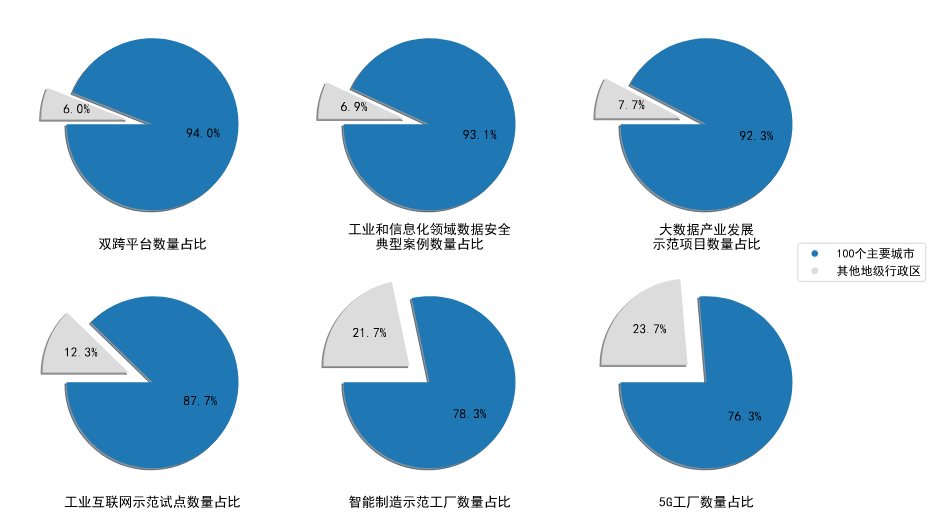 從產業發展特征來看,在工信部發布的 2023 年相關名單來看,在全國 333 個地級行政區劃中,100個工業互聯網主要城市擁有全國 94%的雙跨平臺,92.3%的大數據產業發展示范項目,93.1%的工業和信息化領域數據安全典型案例,78.3%的智能制造示范工廠,76.3%的 5G 工廠,工業互聯網產業發展及應用水平較高。