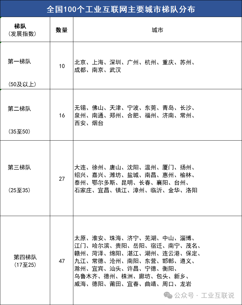 圖:全國100個工業互聯網主要城市梯隊分布
