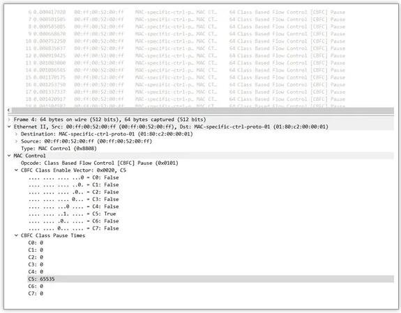 • Opcode (01-01): 明確這是PFC幀,而不是普通的PAUSE幀(Opcode為00-01)。
