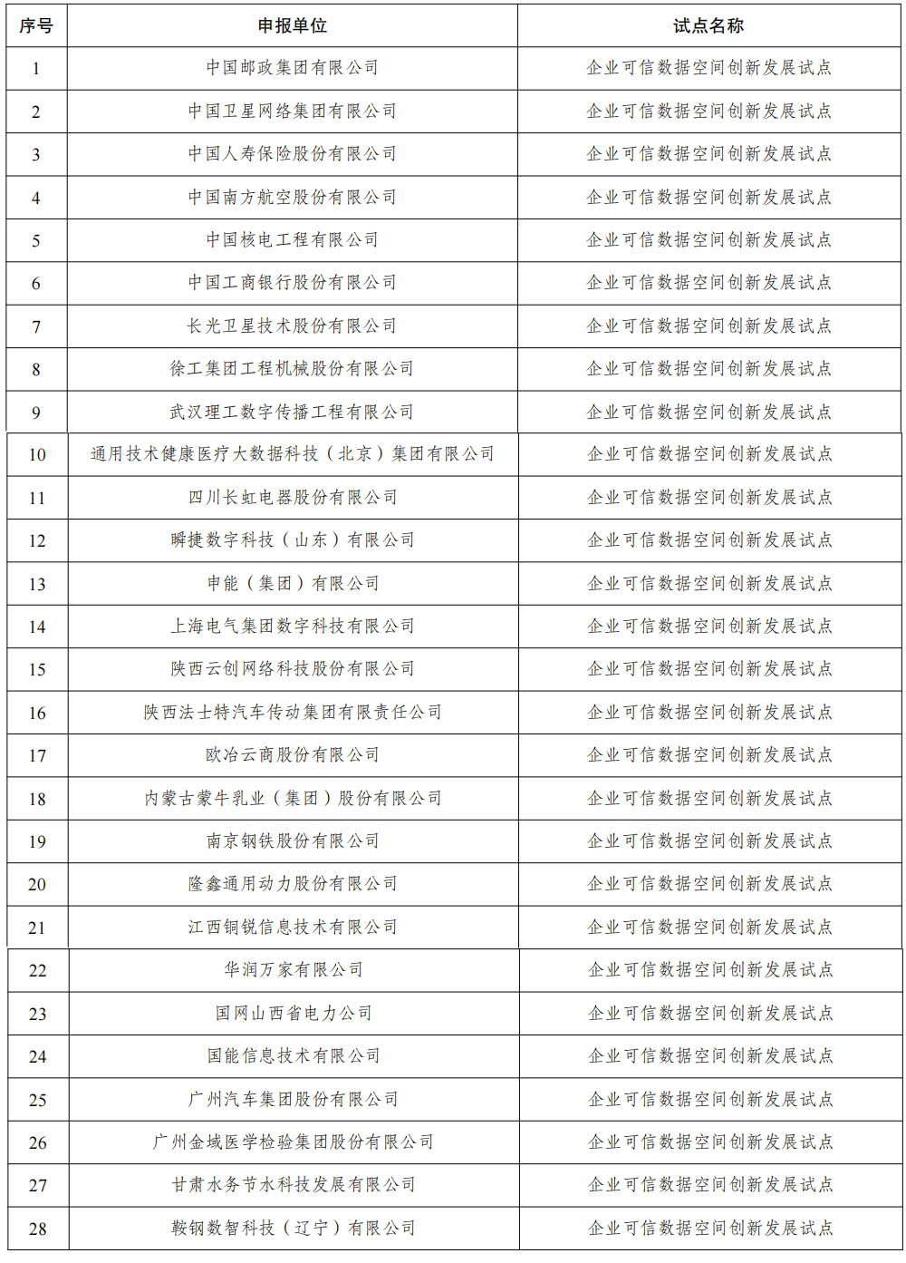 其中,上海數據集團有限公司、南京大數據集團有限公司、貴州大數據產業集團有限公司、中國南方電網有限責任公司、浪潮工業互聯網股份有限公司、中汽數據(天津)有限公司、中國衛星網絡集團有限公司、中國南方航空股份有限公司等分別入選城市、行業和企業試點名單。
