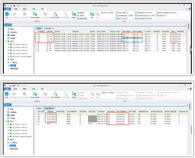 2. 性能測試儀與DUT板卡A相連的m個端口兩兩一對,互發線速背景流(包長1000bytes)。