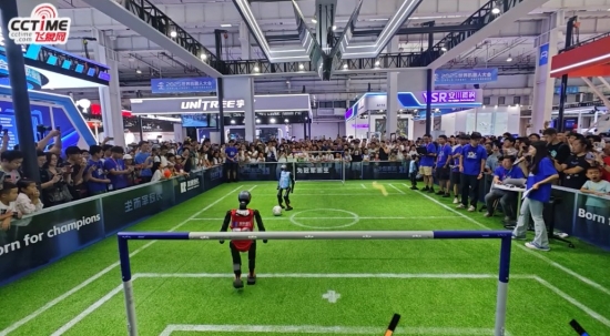 除了機器人拳擊比賽,同樣高人氣的還有機器人足球賽。球場上,加速進化機器人選手T1和K1正激烈拼搶,觀眾為雙方“運動員”加油助威,一個進球將現場氣氛推向高潮,堪比觀看一場真人球賽。