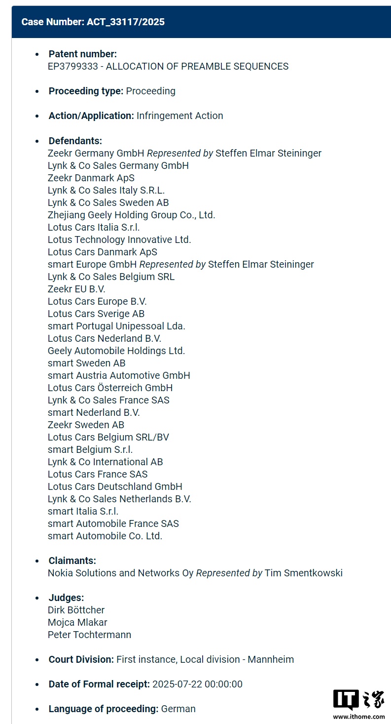 8 月 15 日消息,據海外知識產權媒體 IP Fray 上周報道,諾基亞已對吉利集團及其旗下四大品牌 —— 極氪、領克、路特斯及 Smart—— 發起專利侵權訴訟,波及吉利在歐洲 18 個國家的 32 家分公司。