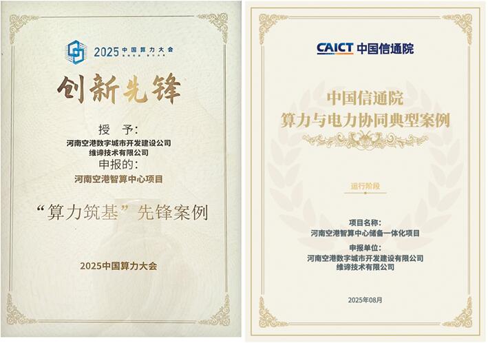 大會期間,主辦方揭曉了備受業界矚目的相關評選結果。河南空港數字城市開發建設有限公司與維諦技術(Vertiv)聯合申報的“河南空港智算中心項目”,榮膺“創新先鋒優秀成果獎”、“典型智算項目案例”兩項殊榮。