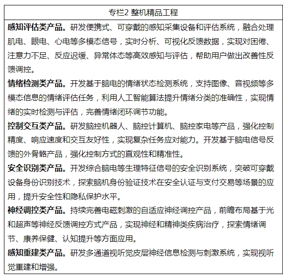 (十六)加強政策支持。加強腦機接口技術攻關和應用示范,推動布局實施一批重大項目,強化協同攻關能力。推動國家制造業轉型升級基金、國家中小企業發展基金等加大投入,實施“科技產業金融一體化”專項,發揮國家產融合作平臺作用,帶動更多資本投入。對植入式腦機接口醫療器械等重點產品加大注冊指導,給予優先支持。用好首臺(套)、首批次保險補償政策,加快產業化落地。