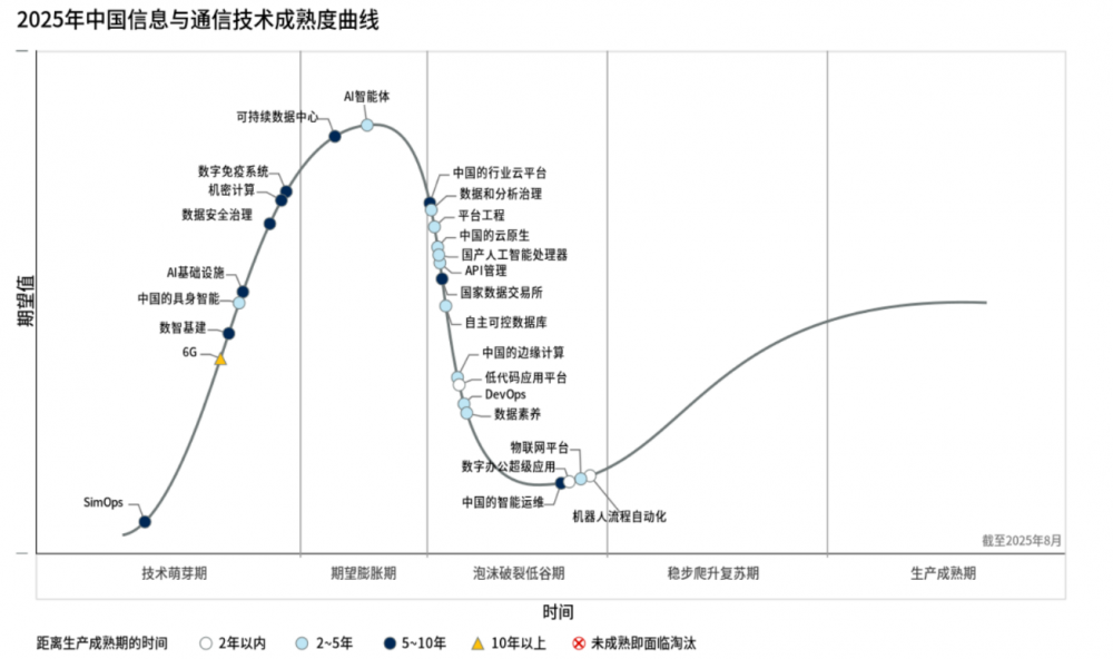 IT行業的技術更迭是無法忽視的,CIO不僅希望通過“平衡游戲”來貢獻業務價值,也希望理解技術相關發展的最新動態。在此次成熟度曲線報告中,部分技術因為過時而被移除,或是被新技術所取代。其中比較明顯的案例便是5G被6G取代、生成式AI被AI智能體取代、工業互聯網被物聯網平臺取代。同時,像是去年中還存在的“數據中臺”因為被認為過時而移除,但在曲線中放入了新的“數智基建”。而像“軟件定義廣域網”“混合云計算”已經不再是CIO的優先事項,現已變為基礎設施經理需要關注的技術,所以也在曲線中進行了移除,也減輕了CIO的負擔。