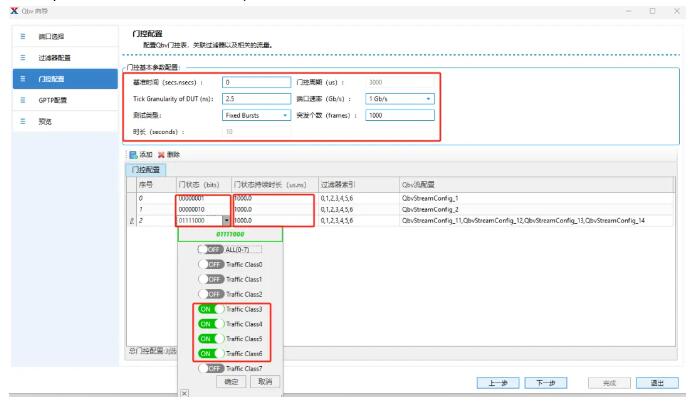 門控中依次添加三個GCL列表項,門狀態中指定門狀態,0為關門,1為開門。列表0放行優先級0流量、列表1放行優先級1流量、列表2放行3、4、5、6優先級流量。門狀態持續時長設置每個列表的持續時間,所有列表持續時間之和為Oper Cycle Time此例設置每個GCL持續時間為1ms,Oper Cycle Time為3ms;過濾器索引為測試儀統計不同GCL放行流量的落點情況。(門控規則與DUT保持一致)