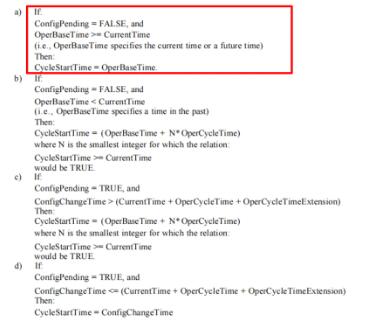 3、Config Pending=TRUE,且Config Change Time>(Current Time+Oper Cycle Time+Oper Cycle Time Extension)那么Cycle StartTime=(Oper Base Time+N*Oper Cycle Time)其中N是滿足關系式的最小整數;