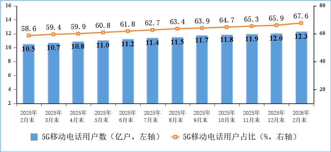 5G用戶數持續增加。截至2月末,三家基礎電信企業及中國廣電的移動電話用戶總數達18.26億戶,比上年末減少100.1萬戶。其中,5G移動電話用戶達12.35億戶,比上年末凈增3044萬戶,占移動電話用戶的67.6%。