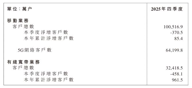 數(shù)據(jù)顯示,2025年第四季度,中國移動用戶總數(shù)達到10.05169億戶,第四季度用戶數(shù)較少370.5萬戶;5G網(wǎng)絡(luò)用戶數(shù)達6.41998億戶,本季度凈增1964.5萬戶。有線寬帶方面,中國移動有線寬帶用戶總數(shù)達到 3.24185億戶,本季度減少458.1萬戶。