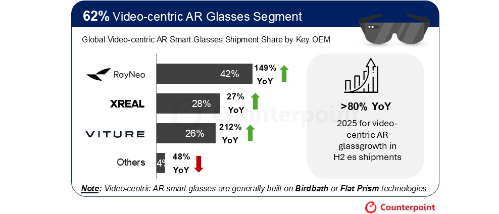 視頻類 AR 眼鏡在 2025 年下半年增長超 80%,市場集中度極高。雷鳥憑借多元化產品矩陣及積極的定價策略,以 42% 的份額占據榜首。