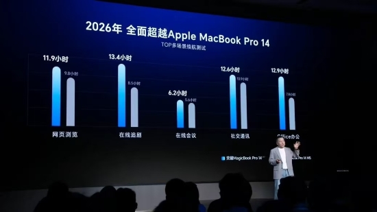 續航與系統體驗方面,MagicBook 系列搭載HONOR Turbo X 技術,MagicBook Pro 14 憑借 CPU 智擎能效供電引擎與核心異構調度引擎,實現X86 平臺 16.7 小時續航,首次超越 Apple MacBook Pro 14。全新 Magic 視界通過桌面空間引擎與動效系統引擎,純凈流暢引擎可釋放 2G 以上內存,桌面操作性能提升 15%,實現設備久用如新。