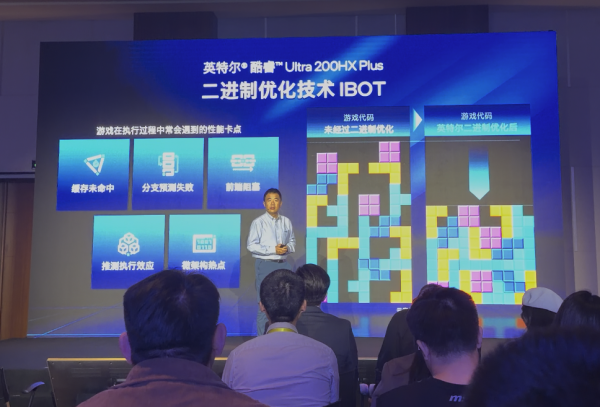 現場伴手禮口袋中多面色彩的魔方則似乎預示AI高靜游戲本Plus背后的芯片升級。英特爾在發布會現場用俄羅斯方塊來形象比喻新一代英特爾酷睿Ultra 200HX Plus處理器中二進制優化技術(IBOT),高宇將在沒有優化的處理器運行情況下,如同胡亂堆砌的不規則方塊,稱之為“CPU運行氣泡”,而空轉的CPU并不能產生實際運行效果。通過IBOT方式優化后,可擠出大量氣泡,提升CPU執行效率。
