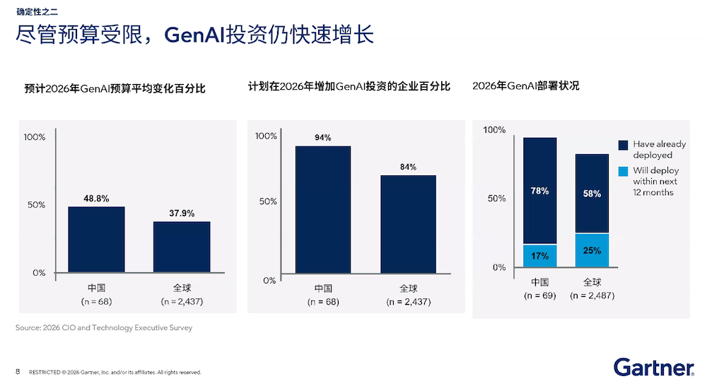 與IT預(yù)算縮減相對應(yīng)的正是生成式AI投資預(yù)算的增加,在中國預(yù)計今年GenAI的預(yù)算會增加48.8%,高于全球的37.9%。據(jù)陳勇介紹,在Gartner的調(diào)研中,有94%的企業(yè)說:“我會在這方面增加投入”,全球是84%。在2026年已經(jīng)部署GenAI的已經(jīng)有78%,而全球平均只有58%。