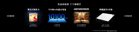 性能配置方面,該機搭載第五代高通驍龍 8 旗艦芯片,配合榮耀冰封散熱架構,實現穩定滿血性能釋放,可滿足多任務處理、視頻剪輯、AI 運算、大型游戲等高強度場景需求。內置 10100mAh 大容量電池,支持 66W 超級快充與 27W 反向充電,可應急為 iPhone 等設備補電。同時配備自研星環四天線,支持雙 Wi-Fi 7 加速,實現超遠距網絡覆蓋;八揚聲器搭配第三代空間音頻技術,影音體驗全面升級。
