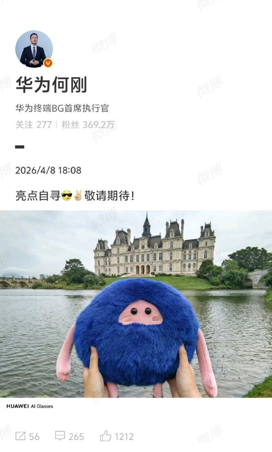 4月8日晚間消息,華為終端BG首席執行官何剛今日在微博上發文稱,“亮點自尋,敬請期待!”同時配了一張帶有HUAWEI AI Glasses水印的圖片。